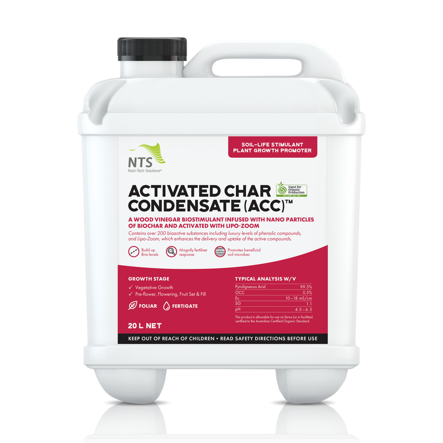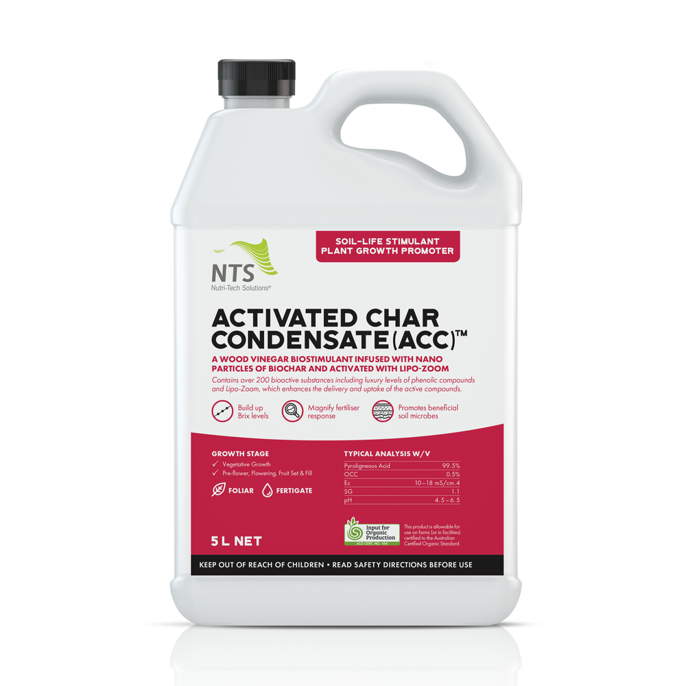 Activated Char Condensate (ACC), from NTS, represents a genuine breakthrough in wood vinegar formulation. Many studies suggest a synergy between wood vinegar and Biochar, and this potent liquid is the first product capitalizing on that synergy. The rich dark hues relate to the presence of Biochar nano particles.