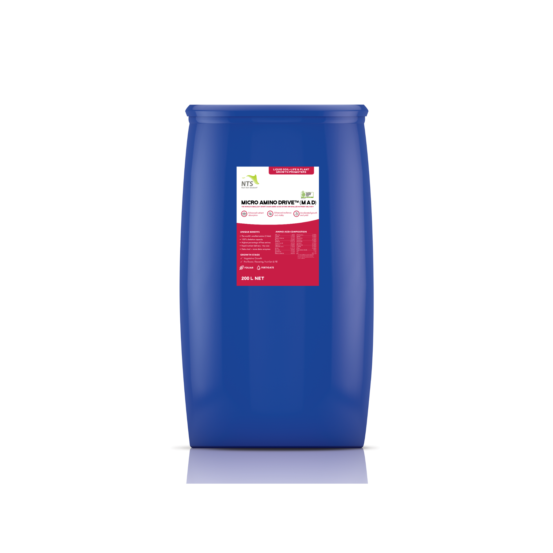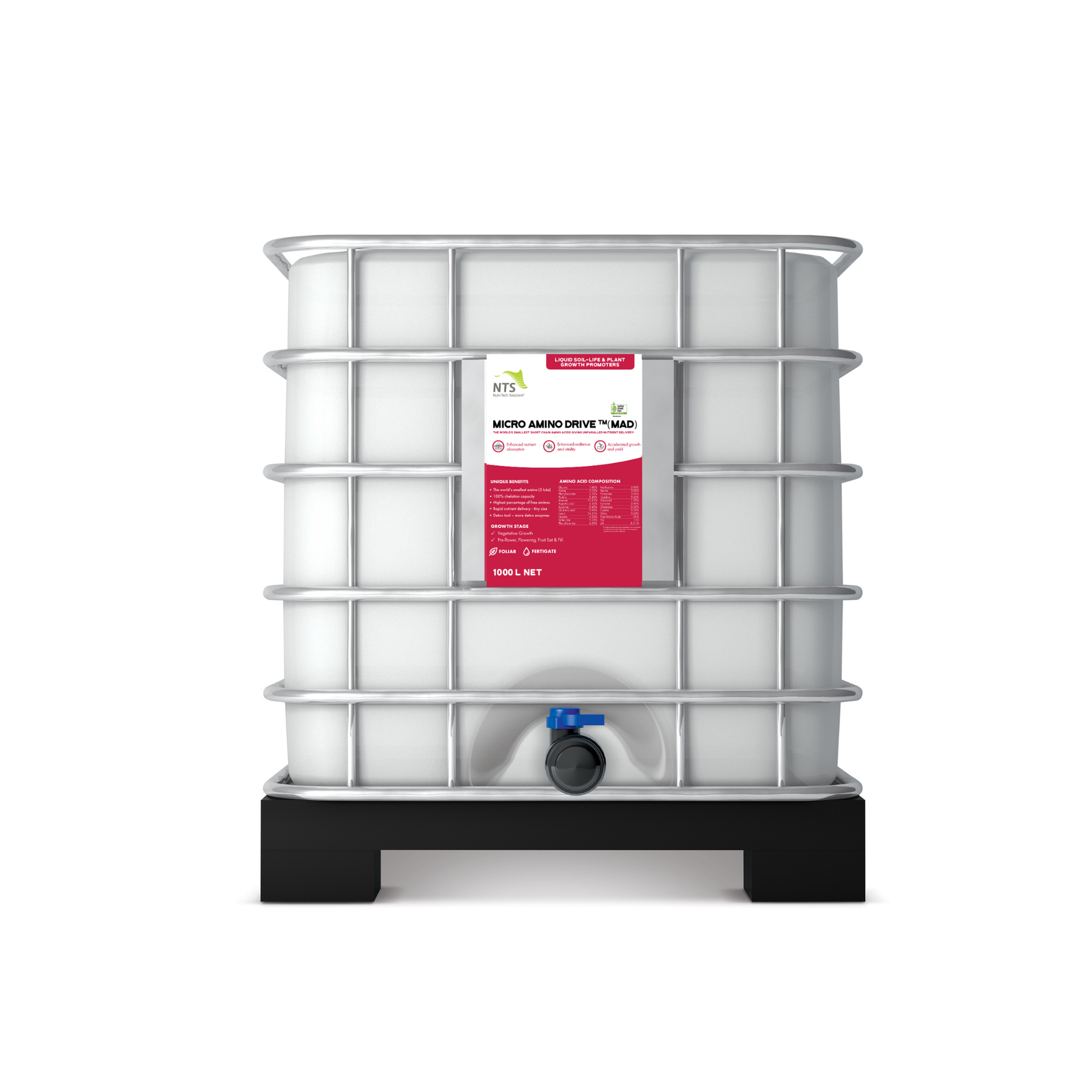 It is possible to create a phytotoxic reaction if amino acid products are applied in concentrated form. Do not exceed 1:100 concentration. Avoid spraying close to harvest if produce is susceptible to staining. Note: Product in 1000 L tanks may weigh over 1 tonne. Forklift with 2 tonne lifting capacity is recommended