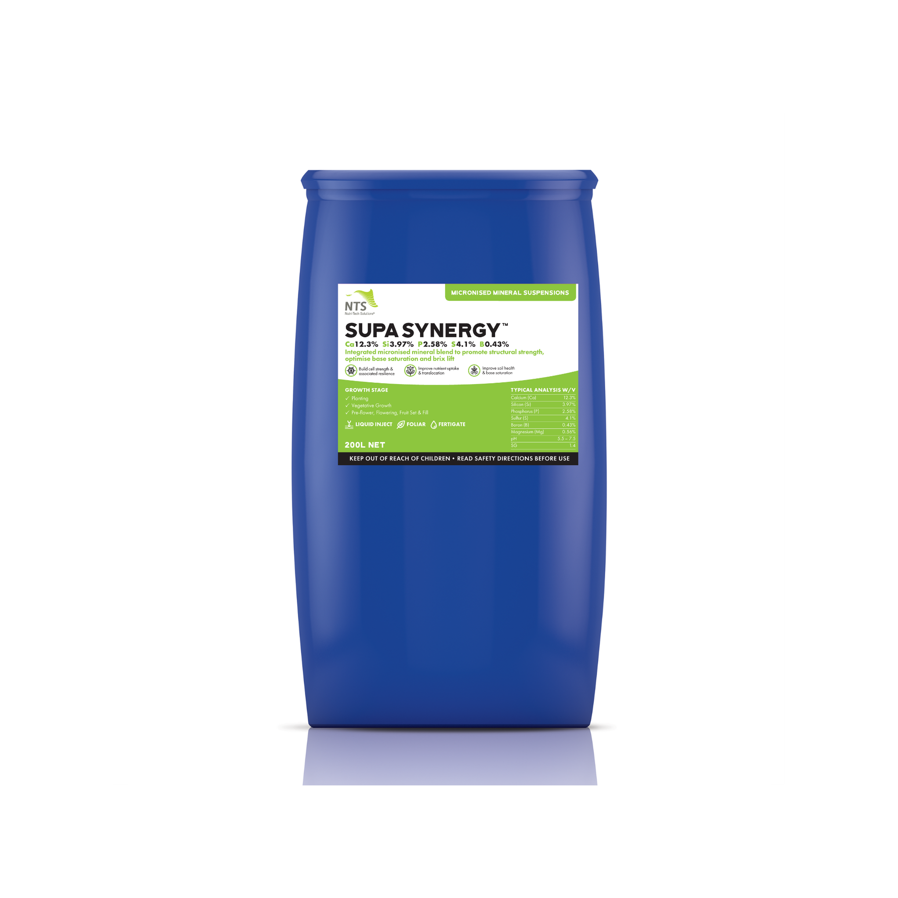 Supa Synergy™ is an integrated micronised mineral suspension designed to strengthen plant structure, optimise base saturation and lift brix across a wide range of crops. It delivers highly available calcium, silicon, phosphorus, sulfur, boron and magnesium to support cell wall integrity, resilience and efficient nutrient uptake and translocation. Supa Synergy™ can be applied via soil, fertigation, liquid injection or foliar spray, making it a flexible tool for both soil regeneration and in-crop nutrition. Regular use supports improved soil health, stronger plants and more productive, resilient farming systems.